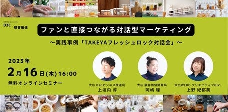 本ウェビナーでは、人気の「フレッシュロック」ブランドを展開されるTAKEYAさまの、顧客との対話会の設計~実施内容から、顧客の声を踏まえて自社のCRM施策やマーケティングに活かしていく様子について、事例を交えて一連の具体的な取り組みをご紹介します。