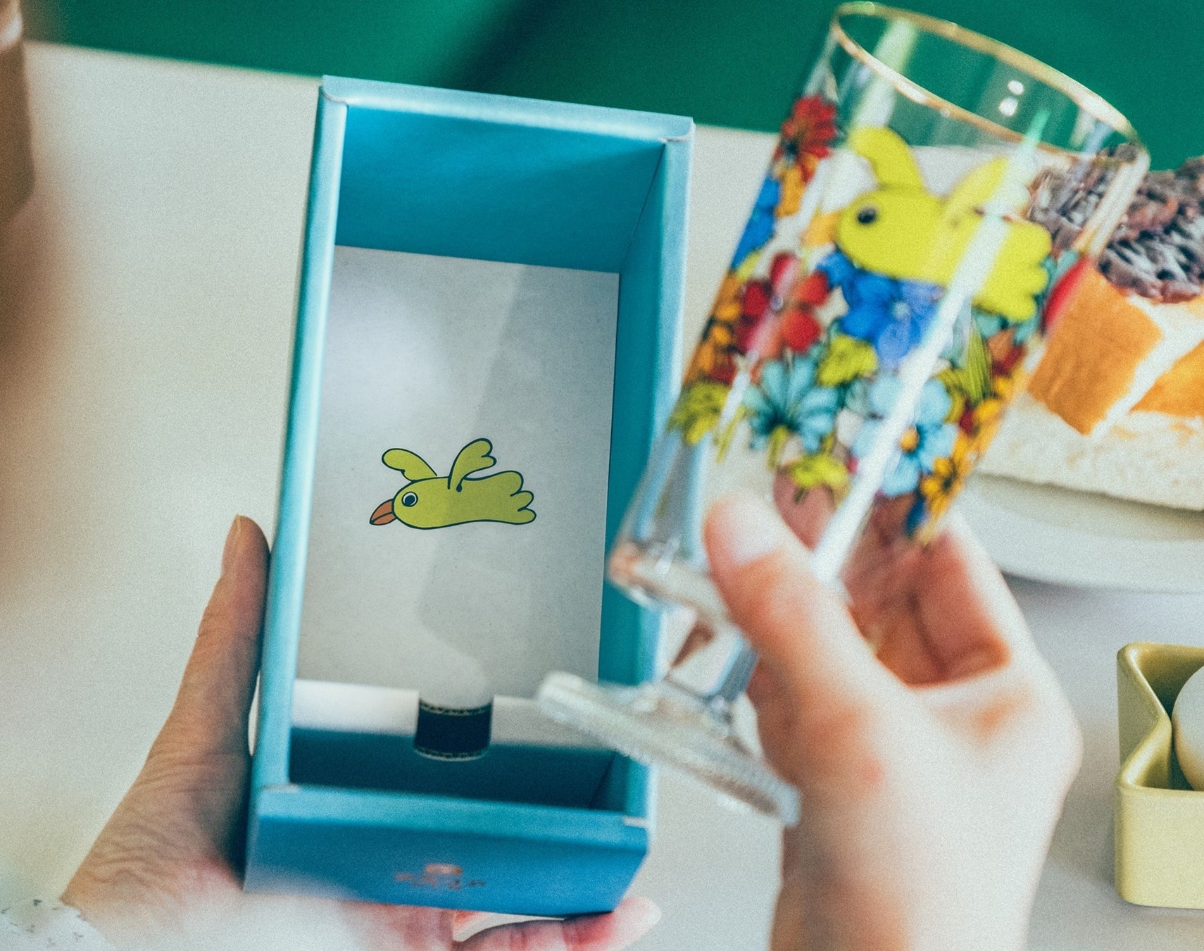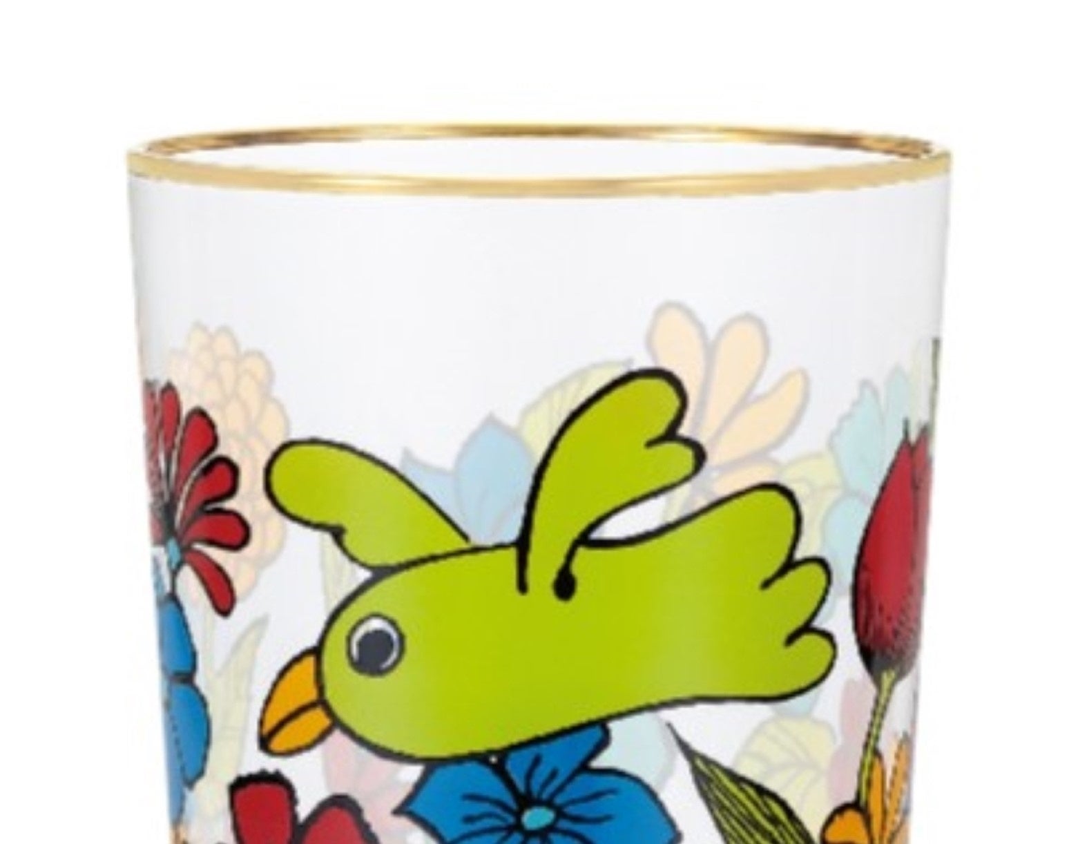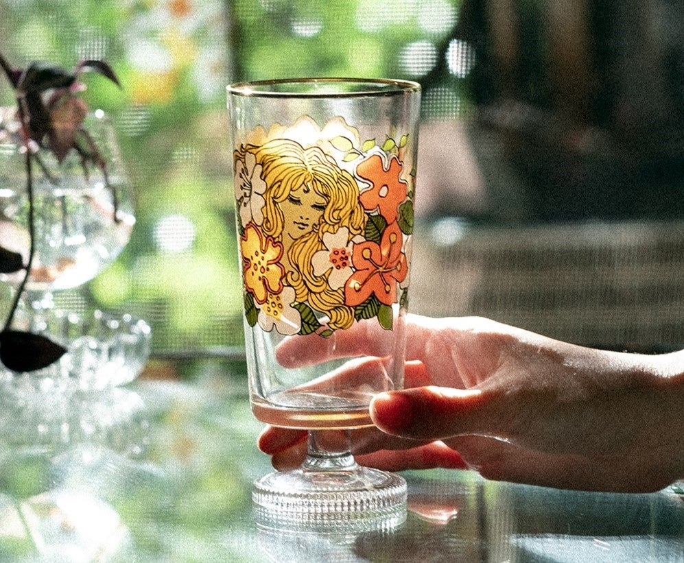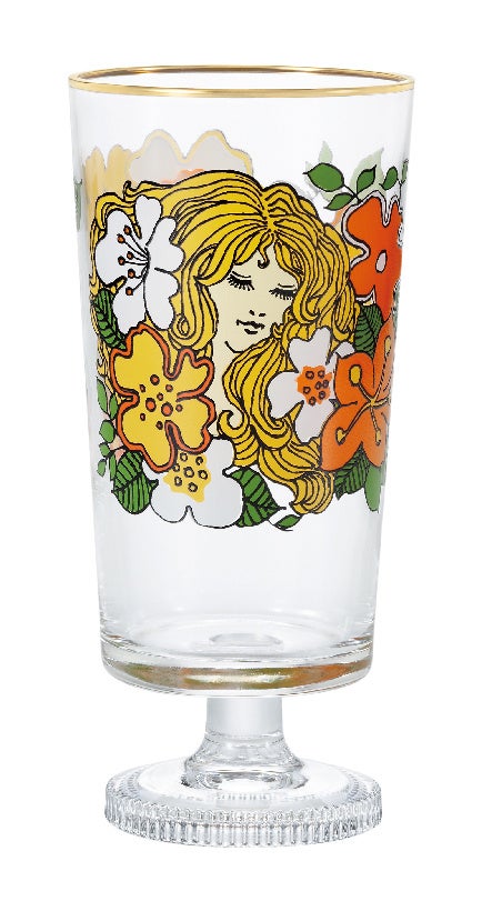 極彩色の花々の中に鳥が飛ぶ「トリピカル」は、昭和46(1971)年に発売された柄です。ふにゃふにゃとした脱力系のタッチで描かれている鳥がとってもユニークです。その翌年にあたる昭和47(1972)年には、咲き乱れる花々の中に美女が眠る「セニョーラ」が発売されました。いずれも本シリーズのプリントグラスの色数(通常2~3色)とは異なり、6色ものガラス絵具を贅沢に使用したカラフルな柄です。おなじみの脚付きグラスに口部には金巻を施したゴージャスなデザイン、パッケージにも金の箔押しを採用した特別仕様となっています。