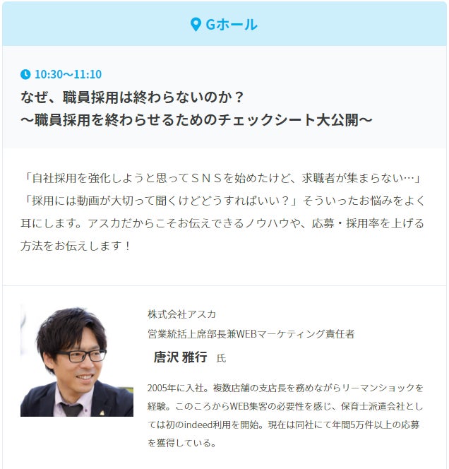 テレビ大阪・テレビ大阪エクスプロ主催、チャイルドケア2023 ー保育園・幼稚園・認定こども園の新たなステージを目指す専門展ー にて保育に特化した求人・人材サービス会社 株式会社アスカ(本社:群馬県高崎市、代表取締役:加藤秀明)の上席部長唐沢雅行が登壇いたします。また、会場内にてブースも出展いたします。