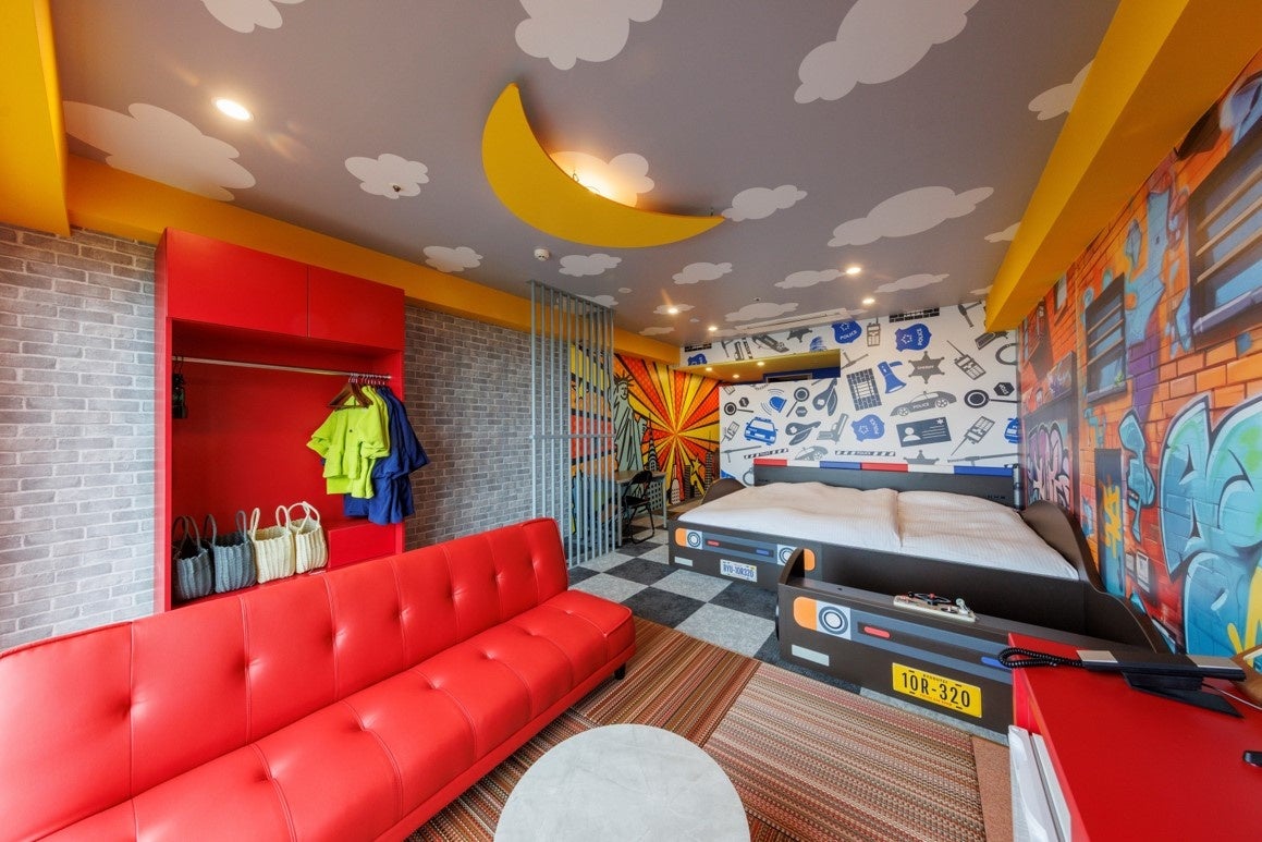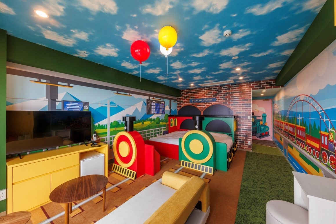またコンセプトルームは一昨年のキッズルーム、昨年のTRAIN/BUSルームに続く第3弾。今回オープンするお部屋は乗り物をテーマにSLルームやパトカールーム、スペースシャトルや工事車両など10種の乗り物をそれぞれテーマとした楽しいコンセプトルームです。それぞれカラフルな色合いをベースにした内装で乗り物型のベッドや2段ベッドなど楽しい仕掛けがいっぱいのお部屋です。