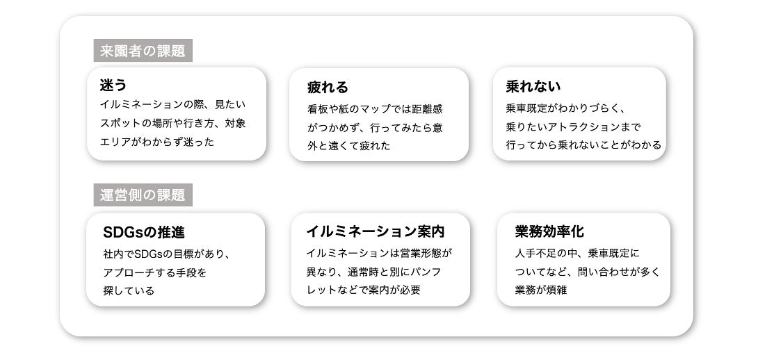 従来は、各アトラクションの細かな乗車既定一覧を紙のマップに掲載していましたが、一覧では施設の位置情報がわかりづらく、乗れると思ってアトラクションまで移動した後に乗れないことがわかる、といったことが起きていましたが、導入により解消されました。