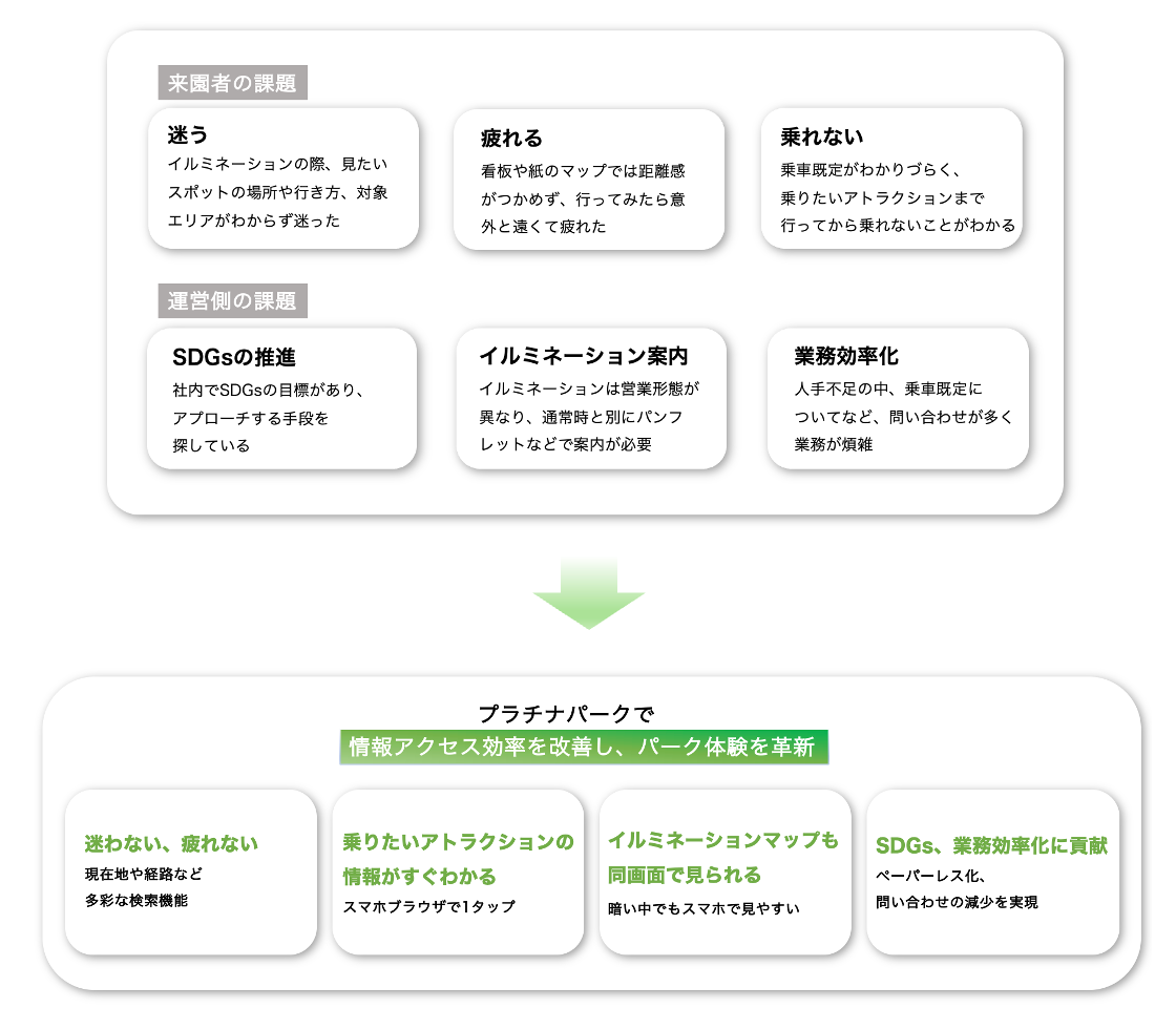 「さがみ湖リゾートプレジャーフォレスト デジタルマップ」はスマートフォンのWEBブラウザからアクセスできるデジタルマップです。「イルミネーションイベントの際、見たいスポットの場所や行き方、イベントの対象エリアがわからず迷った」「看板や紙のマップはデフォルメしてあるので距離感がつかめず、行ってみたら意外と遠くて疲れた」「乗りたいアトラクションがあるが、乗車既定を満たしているかどうかがわかりづらく、現地で聞いたら乗れなかった」といったお客様(来園者)のお困りごとを解決すべく、従来の紙やPDF、看板などの園内マップをデジタル化することで、情報アクセス効率を改善しました。