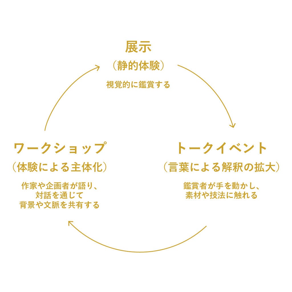 本企画展では、展示を鑑賞してもらうだけではなく、より深い理解を得るためにその構造を「作品そのものを味わう場」(展示)、「言葉を通じて理解を深める場」(トークイベント)、「体験を通じて共創する場」(ワークショップ)の3つに分けての実施を予定しています。この三層が重なり合うことで、展覧会は「静的な鑑賞」から「動的な学びと交流」へと拡張し、より豊かな文化的体験を生み出すことを目指しています。それぞれの構造を単独で成立させつつも連動性を持たせることで、知識の深化を図り「香りの視覚化」とともに自身の心地よさを見つける機会を提供したいと考えています。