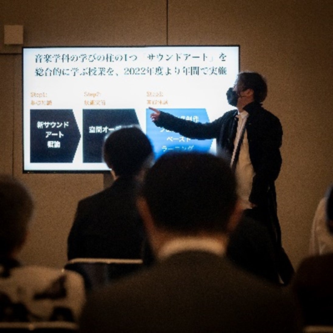 続いてevala客員教授が登壇し、「実験ドーム自体は私が大阪芸術大学の学生だった時から存在していたものの、授業にはあまり活用されていなかった印象でした。リニューアルに際して、当時の設計思想や建築機構を知るにあたり、本施設がその名の通り、1981年の設計当時からとても“実験的”かつ“挑戦的”なものであると実感しました。設立当時のユニークな思想を受け継ぎつつ、最新鋭のテクノロジーによって空間音響を学べる世界最先端の教育施設へとアップデートしました。」と、リニューアルへの想いを語りました。
