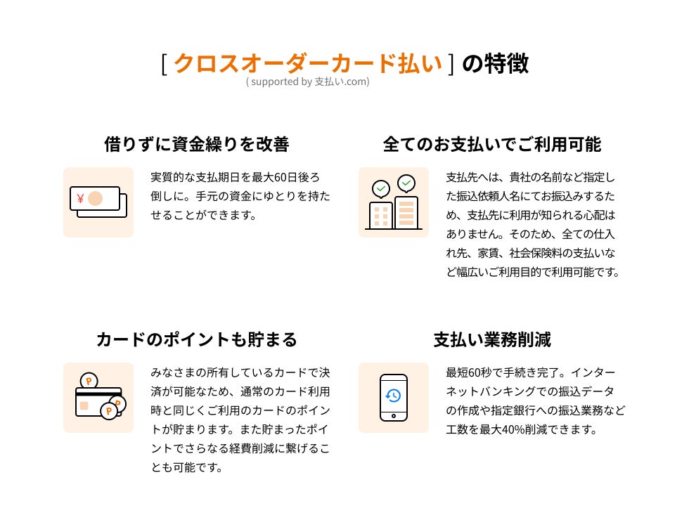 「クロスオーダーカード払い supported by 支払い.com」は、BtoB取引で発行された銀行振込払いが必要な請求書を、お手持ちのクレジットカードで支払うことができるサービスです。卸売業者側の対応可否に関わらず、飲食店側はクレジットカード決済をすることが可能となり、実質的な支払い日をカードの引き落とし日まで先延ばしすることができます。また、仕入れ先が多くて振り込みにかかる業務が煩雑になりがちであった経理業務についても、1社あたり最短60秒で決済手続きができるため、大幅な手間削減に繋げることが可能です。
