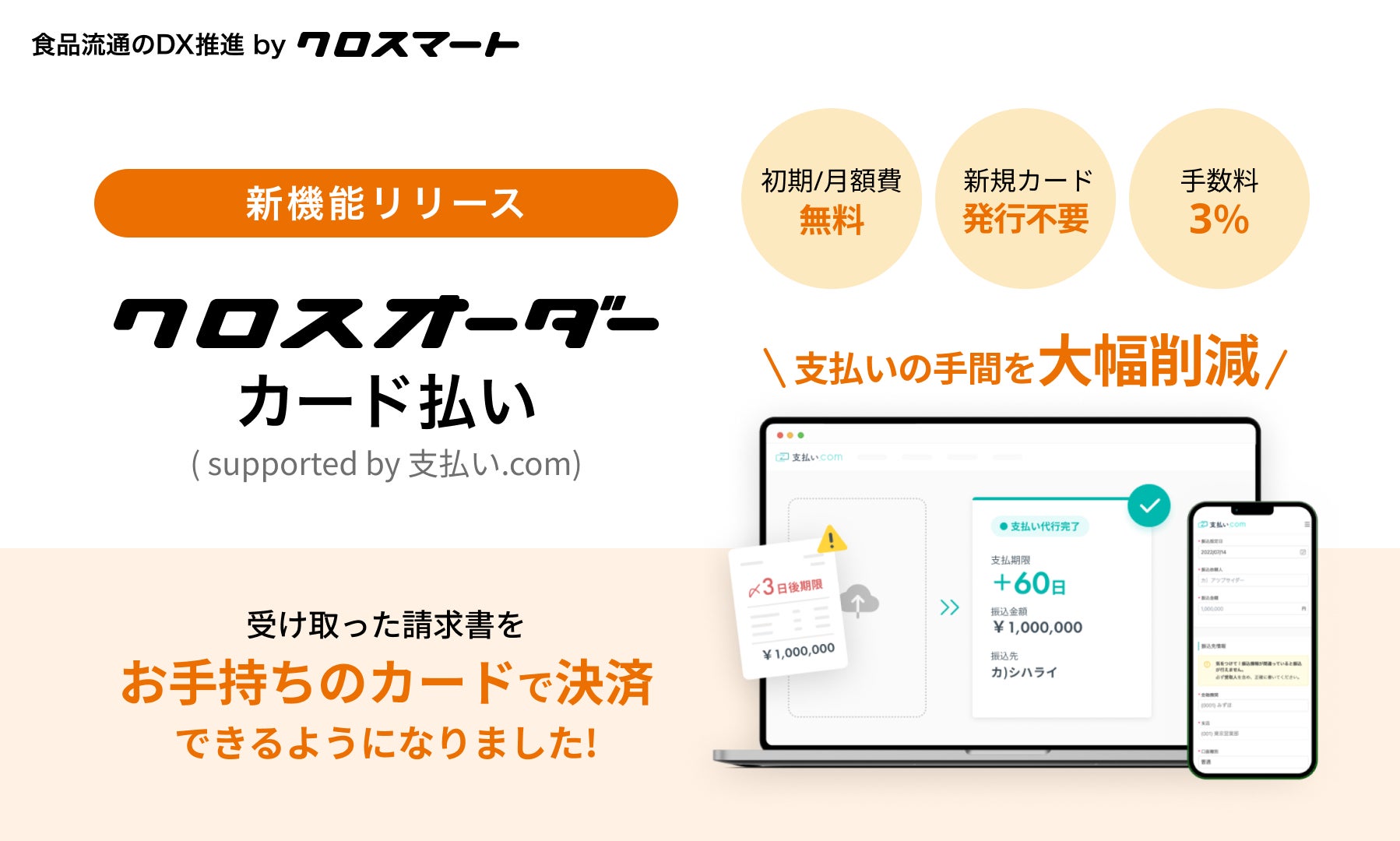 食品流通のDXを推進するクロスマート株式会社(本社:東京都中央区、代表取締役:寺田佳史、以下「当社」)は、株式会社クレディセゾン(本社:東京都豊島区、代表取締役(兼)社長執行役員COO:水野克己)と株式会社UPSIDER(本社:東京都港区、代表取締役:宮城徹・水野智規、以下:UPSIDER)が共同で運営する決済サービス「支払い.com」と提携し、Visa推奨の新たな法人決済スキーム「BPSP(Business Payment Solution Provider)」に基づく中小飲食店向け決済サービス「クロスオーダーカード払い supported by 支払い.com」を2024年1月9日より提供開始しました。