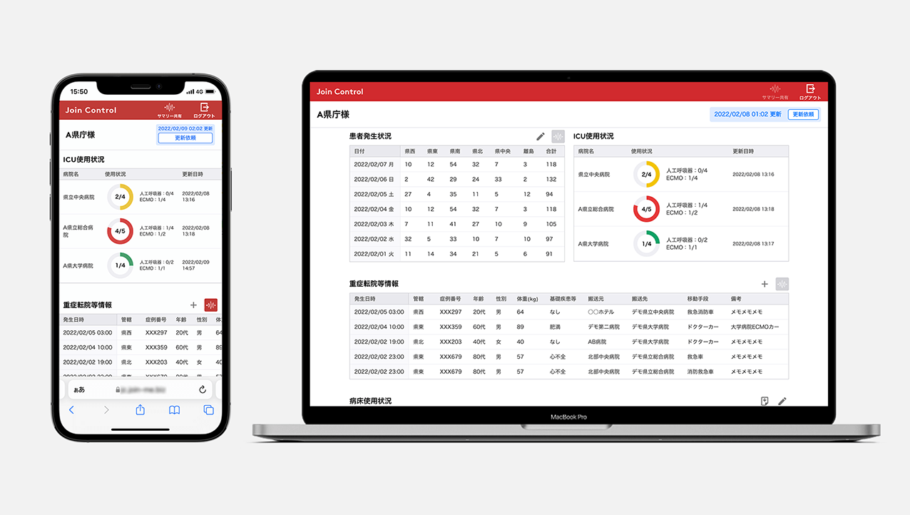 しかしながら現場では、リアルタイムに共有されるべき情報であっても、各医療機関からのエクセルでのデータ収集、手作業での集計・グラフ化、関係者へのメール配信などに時間と手間がかかり、情報共有のタイミングを逸していることが大きな課題であり、情報連携方法の改善が求められていました。 そこでアルムは、患者発生状況やICU・病床使用状況などを可視化し、一元管理できる医療提供体制支援ソリューション「Join Control」を開発し、提供を開始しました。