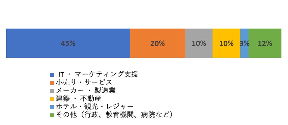 最も反響が大きかったのはITやマーケティング支援(45%)、次いで、小売り・サービス業(20%)、メーカー・製造業 (10%)、建設・不動産業(10%)、ホテル・観光・レジャー (3%)となります。その他、大学などの教育機関、病院、行政などからも多くのお申込みやお問い合わせをいただいています。(図1)