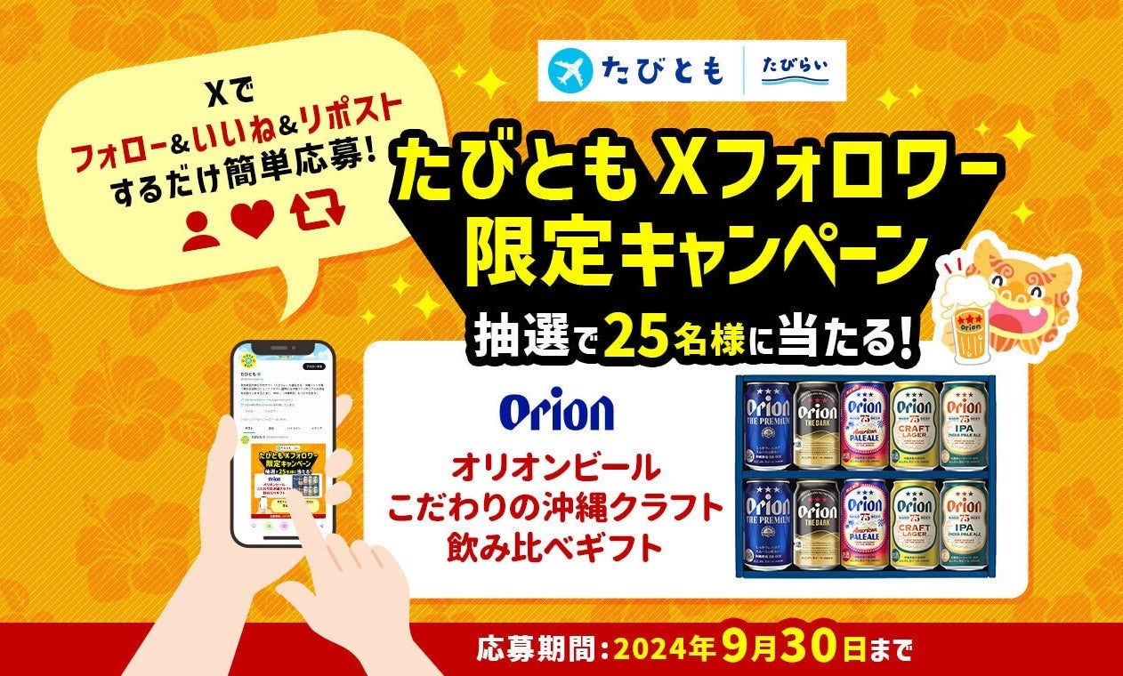 2024年9月9日(月)~9月30日(月)までの期間中、たびともの公式Xアカウントを「フォロー」し、Xのプロフィールに固定しているキャンペーンポストを「いいね」「リポスト」していただいた方の中から抽選で、『オリオンビール こだわりの沖縄クラフト 飲み比べギフト』を25名様にプレゼントいたします。