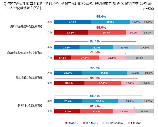 「香りをきっかけに、異性に良い印象を抱いたり、意識するようになったり、魅力を感じたり、ドキドキしたりしたことはありますか」と尋ねたところ、全体の約9割(88.2%)が「良い印象を抱いた」、約8割(77.0%)が「意識するようになった」、約9割(87.4%)が「魅力を感じた」、8割以上(84.8%)が「ドキドキした」 と回答しました。(パーセンテージは「よくある」「たまにある」「1度くらいはある」の合計)