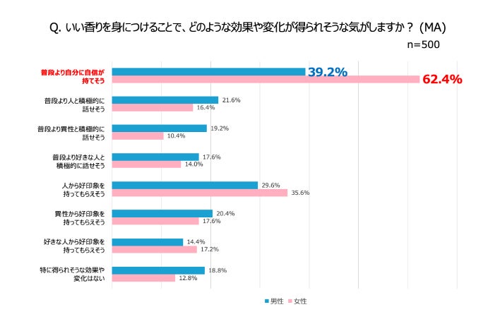 「いい香りを身につけた時、あなたにはどんな感情の変化がありますか」という質問に対し、半数以上(54.0%)が「気分が上がる」と回答。次いで、「リラックスする」が36.6%、「自信がつく」が26.8%、「元気が出る」15.2%でした。全体から「特に変化しない」と回答した人を除くと、男性の約8割 (77.2%)、女性の約9割(89.2%)となり、多くの人がポジティブな気持ちの変化を実感していることが分かります。また、「いい香りを身につけることで、どのような効果や変化が得られそうな気がしますか」との質問に、「普段より自分に自信が持てそう」と答えた人は、男性は約4割(39.2%)、女性は6割以上(62.4%)で、香りが自信の後押しになっている可能性が伺えました。