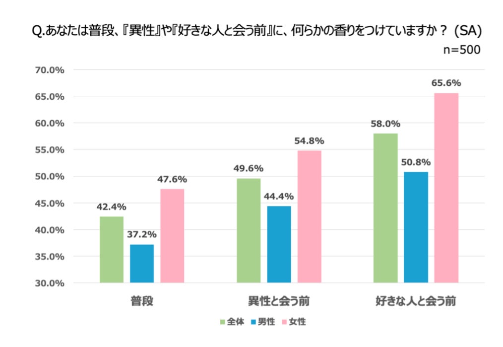 女性では、「普段からつける」5割以下→「好きな人と会う前」7割近くまで増加