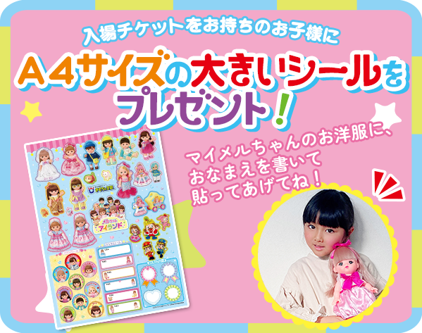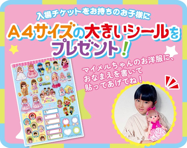 「メルちゃんアイランド」は「いっしょに遊ぶ、いっしょに育つ」をテーマに、メルちゃんの世界観の中で、情操教育に有用なごっこ遊びや、メルちゃんと同じ服を着ることができるフォトコーナー、人気の電車アトラクションなど、様々な遊びを楽しむことが出来ます。入場チケットをお持ちのお子様には、メルちゃんのA4サイズの大きいシールをプレゼントします。