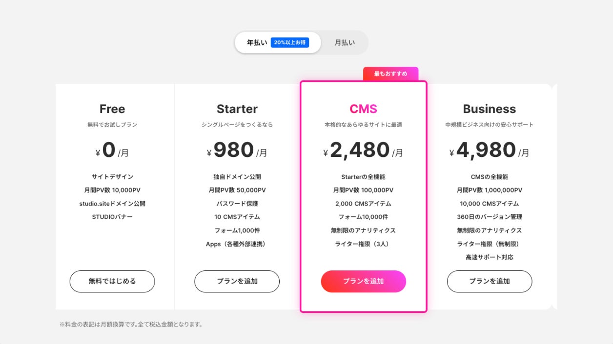 STUDIOは制作するサイトに合わせて月額プランを選択できます。詳細は「STUDIO」サービスサイトをご確認ください。