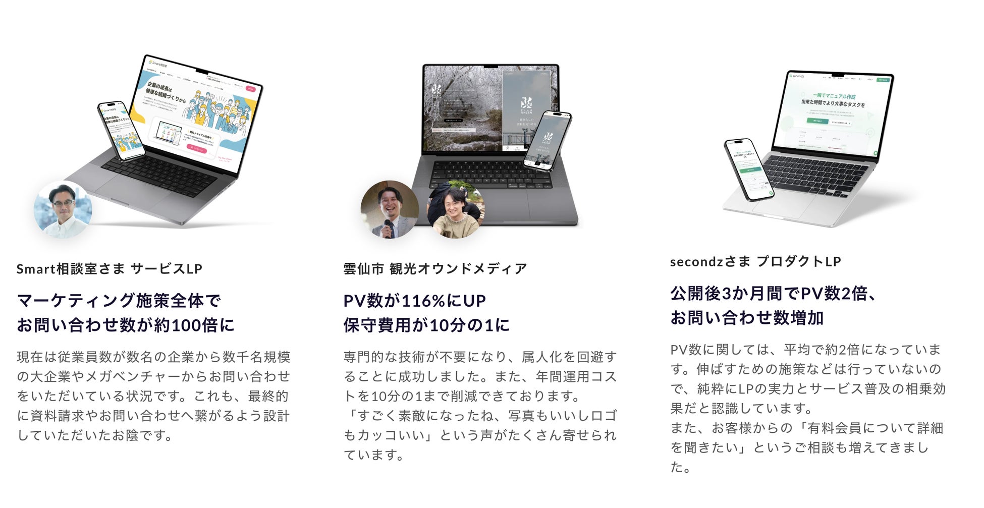 350サイト以上の制作実績を持つgazが迅速に制作プロジェクトを立ち上げ、事業をサポートします。国産ノーコード「STUDIO」での制作に特化したワークフローと分業制を廃したワンストップ制作モデルでROIの高い初期制作と運用体制構築を支援します。
