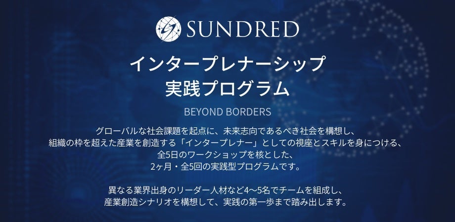 100個の新産業の共創を目指す「新産業アクセラレーター」SUNDRED株式会社(所在地:東京都渋谷区、代表取締役:留目 真伸、以下:SUNDRED)は、2022年5月より、日本初(※)となるインタープレナーシップ実践プログラム「BEYOND BORDERS」を開講します。本プログラムは、グローバルな社会課題を起点に、未来志向であるべき社会を構想し、組織の枠を超えた産業を創造する「インタープレナー」を育成するための全5日のワークショップを核とした、2ヶ月間の実践型プログラムになります。また、これに合わせて、4月中に「BEYOND BORDERS」説明会を複数開催します。