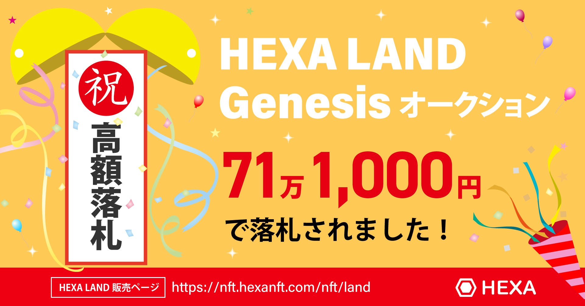 NFTマーケットのHEXA(ヘキサ)では、HEXAの発展・成長によってコミュニティみんなが利益を得られるWEB3.0の実現のため、HEXA LAND NFT(ヘキサランドNFT)のGenesisオークションが開催され、71万1,000円で落札されました。