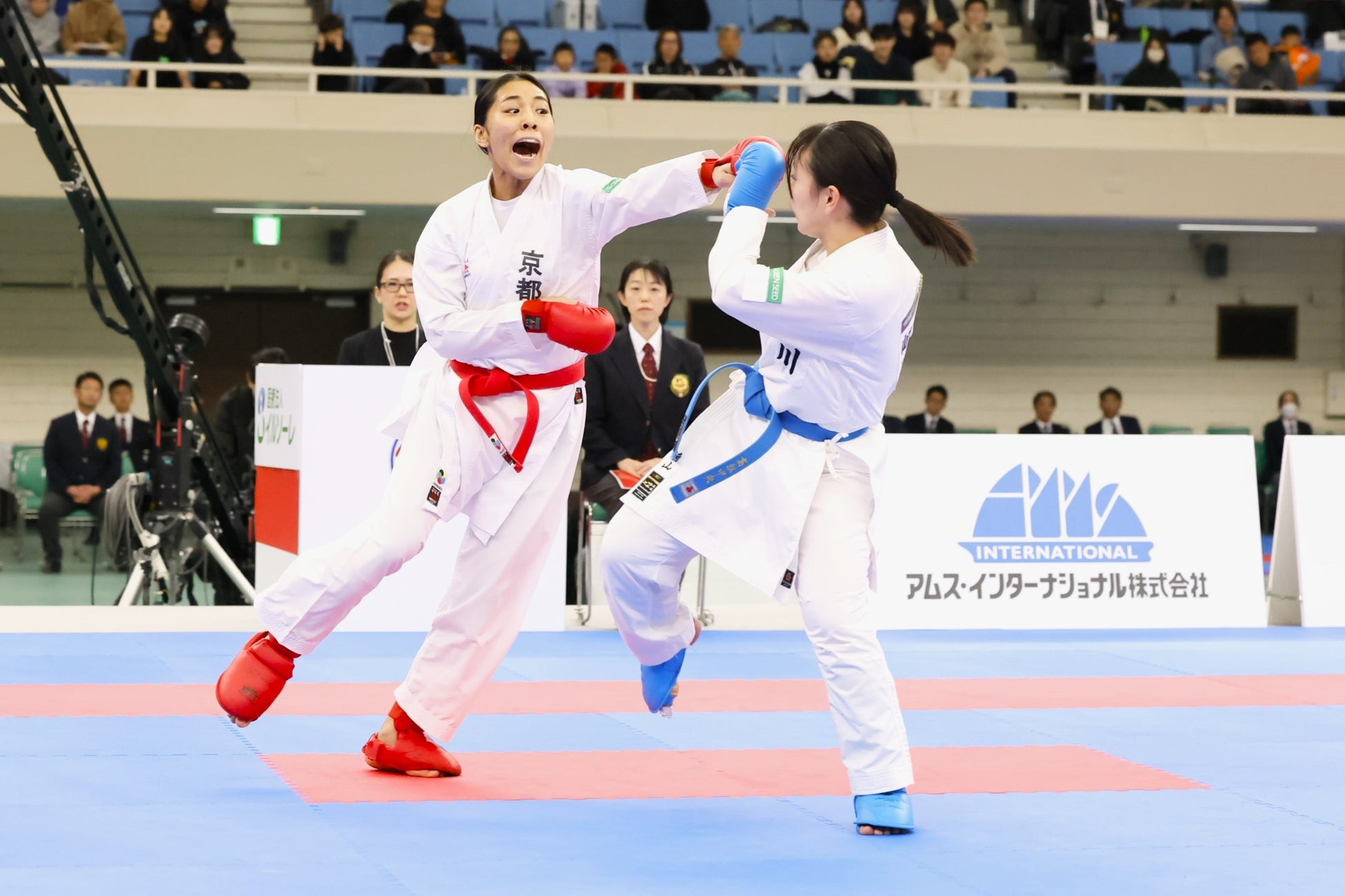 永井カンナ(学校法人国士舘)、寺澤紗良(学連・中部学院大学3年)、嶋田さらら(全空連推薦)、釜つばさ(全空連推薦・同志社大学3年)などの強豪を制して決勝に進んだのは、京都産業大学4年生の小堂利奈と、高松中央高校3年生の崎山紬。小堂は昨日の団体組手で優勝した京都府のメンバーの一人。崎山は男子組手で決勝に進出した崎山優成の妹です。
