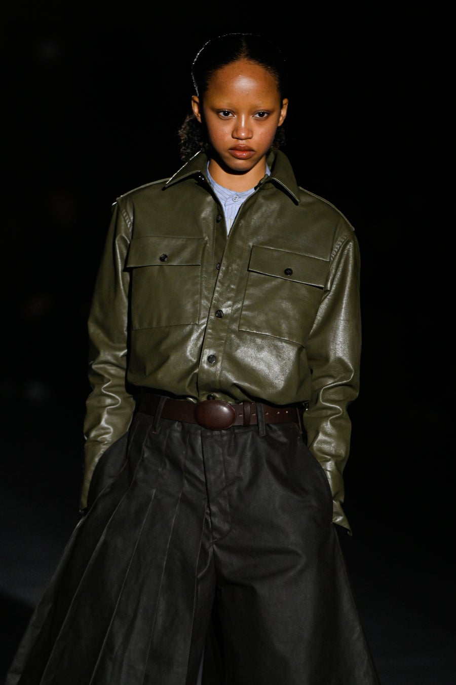 「クラシックかつモダンなメイクアップに、立体的なツヤのあるグロウスキンは欠かせません。ツヤがあることで、マットなアイシャドウやフォギーな質感のブラッシュがよりモダンに見えます。まずは、瞬時にコンディションを整える下地『デイクリーム』を使用し、肌をなめらかに整えました。次に『スキンリフレクト カラーコレクター』(全6色、2025年3月7日新発売)を使用し、それぞれのモデルの肌状態に合わせて色補正しナチュラルに仕上げるためのベースを整えます。その後『ザファンデーション リフトグロウ』で、頬の高いところに狙いすました光が宿ったかのような、メリハリのあるツヤ感を作っていきます。最後に、ADDICTIONのベースメイクアップに欠かせないハイライター『ザ グロウスティック 003P The Sun I can Touch』を、頬骨の高い所に塗布し、ランウェイでも際立つような、上質な艶めきを与えて仕上げました。」