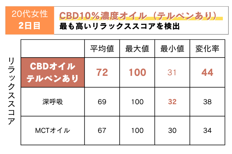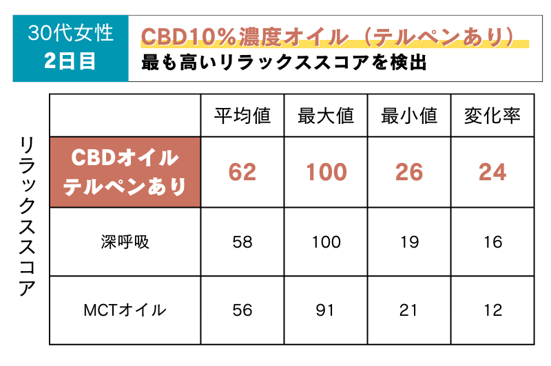 2日目:テルペン配合のCBD10%濃度オイルが最も高いリラックススコアに!CBDに加え、テルペンのリラックス効果が期待できる結果となりました!