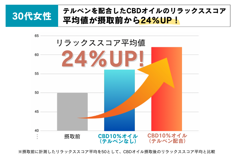 30代女性の結果①と結果②より、CBDオイルテルペンなしとCBDオイルテルペンありを比較した結果、テルペンを配合したCBDオイルのリラックススコア平均値は、摂取前と比較して24%増加しており、テルペンを配合していないCBDオイルよりも、有意なリラックス度を示しました!