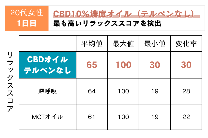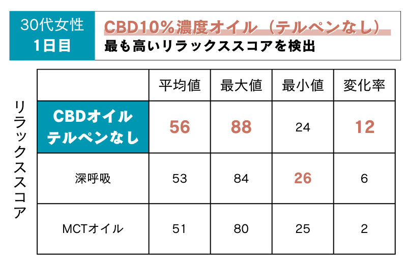 1日目:30代女性と同様、テルペン配合なしのCBD10%濃度オイルが最も高いリラックススコアを検出!CBD自体へのリラックス効果が期待できる結果となりました!