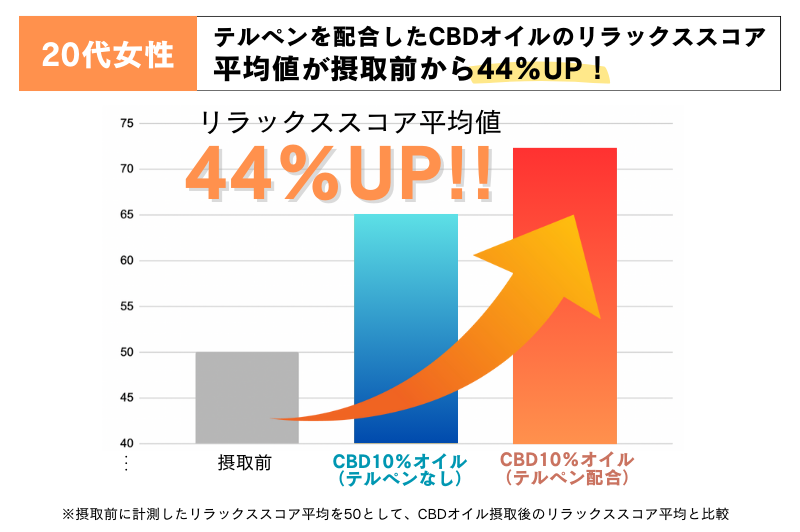 20代女性の結果③と結果④より、CBDオイルテルペンなしとCBDオイルテルペンありを比較した結果、テルペンを配合したCBDオイルのリラックススコア平均値は、摂取前と比較して44%増加しており、テルペンを配合していないCBDオイルよりも、有意なリラックス度を示しました!