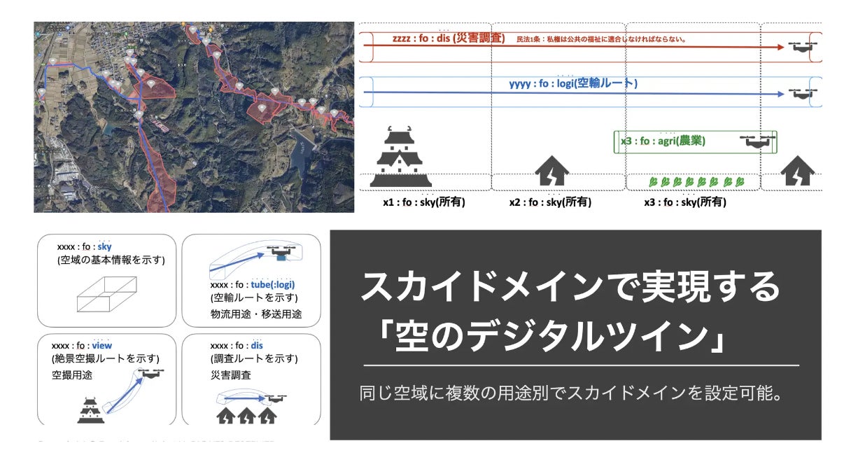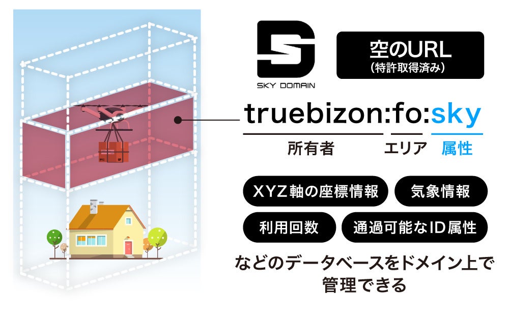 ソラシェアは3次元空間(緯度・経度・高度のデータセット)に名称を与える「スカイドメイン」という仕組みを導入し、世界中の空を識別します。空のURLともいうべき「スカイドメイン」に紐づくデータベースには、空域の3次元情報以外にもドローン飛行の合意状況、インセンティブの内容から、土地や建物の管理者情報、障害物情報、気象などのリスク要素に至るまで格納でき、それらの情報には必要に応じてセキュアな環境から外部からのアクセスも可能な設計となっています。