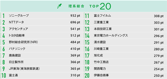 20位の伊藤忠商事、31位の三井不動産など、従来文系学生から就職希望先としての人気が高い企業も上位にランクインしました。事業幅の拡大により理系人材の獲得を積極的に行っており、「理系にも活躍フィールドがある場」として浸透してきているようです。