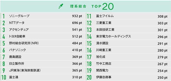 理系総合のトップは、ソニーグループ。2位にはNTTデータが入りました。8位の日立製作所、10位の富士通も含め、各社事業領域は異なるものの、DX推進といったビジネスイノベーションへの取り組みを強化しており、学生からも「高い技術力を有していると感じる」といった声が多くあがりました。
