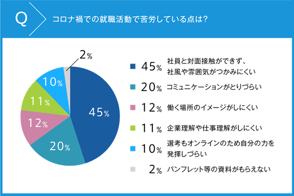 コロナ禍での就職活動で苦労している点について聞くと、「社員と対面接触ができず、社風や雰囲気がつかみにくい」45%、「コミュニケーションがとりづらい」20%、「働く場所のイメージがしにくい」12%と対面であれば普通に得られていた情報を取得するのが難しくなっていることが分かります。