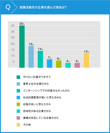 就職希望先の企業を選んだ理由については、「やりたい仕事ができそう」が35%、「業界上位の企業だから」18%と、大手企業という枠で仕事軸を優先している傾向が見られます。「インターンシップでの印象がよかったから」が14%と、早期からの学生への広報活動が重要であることもわかります。