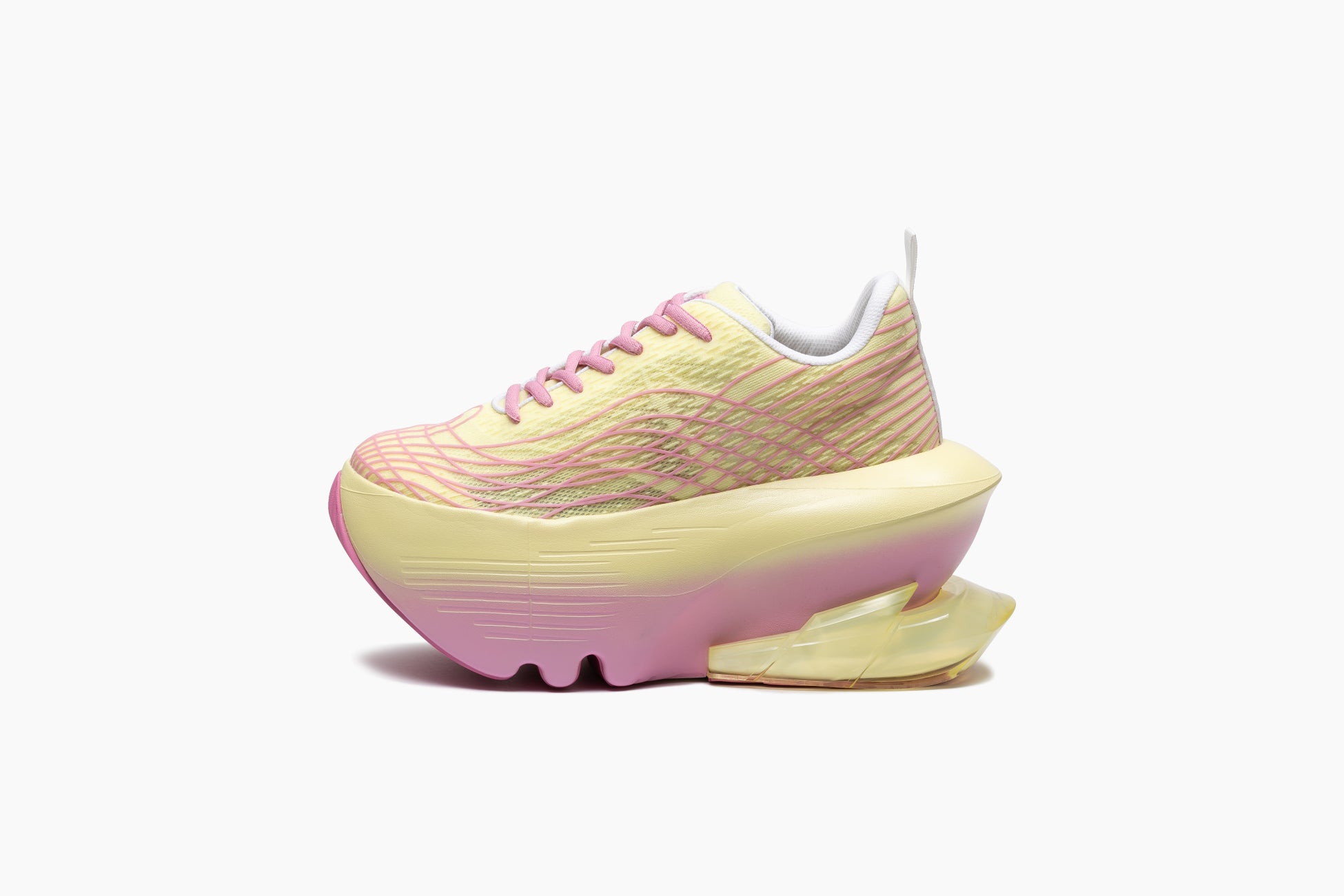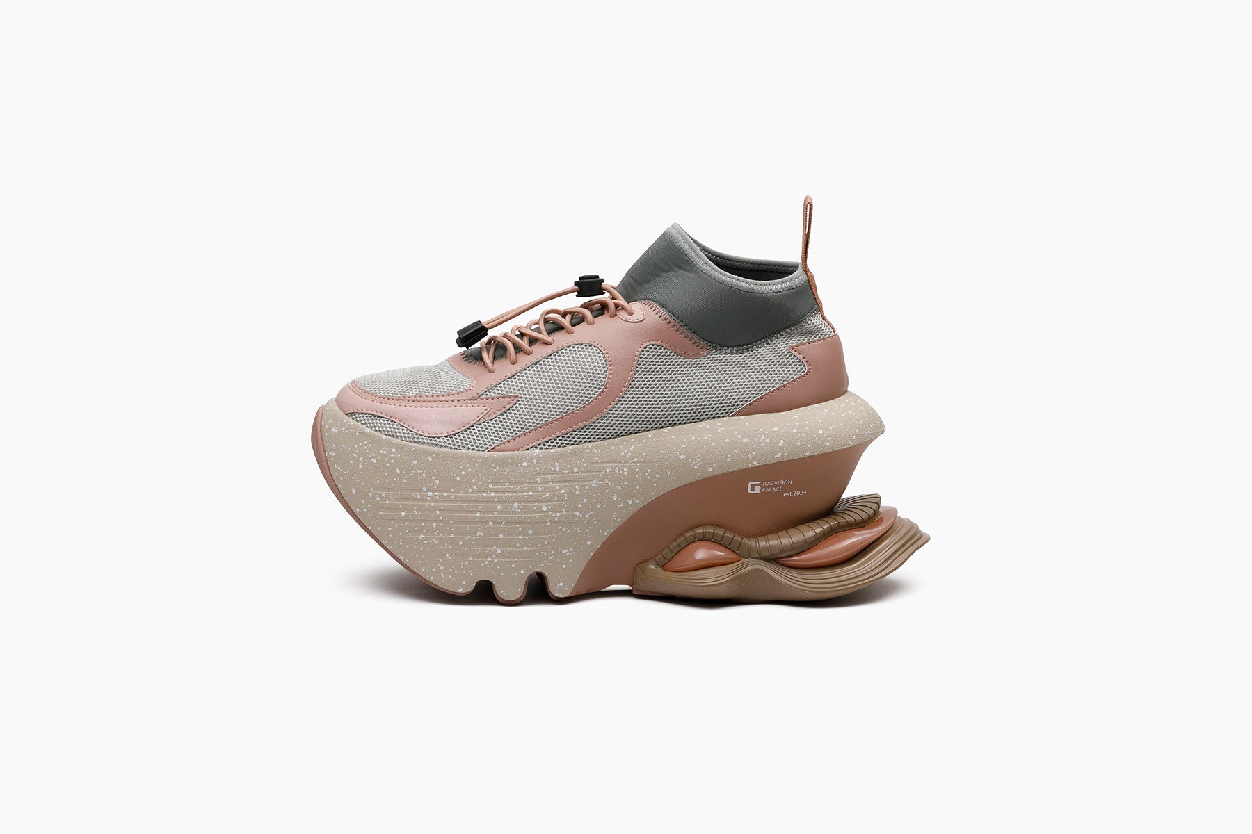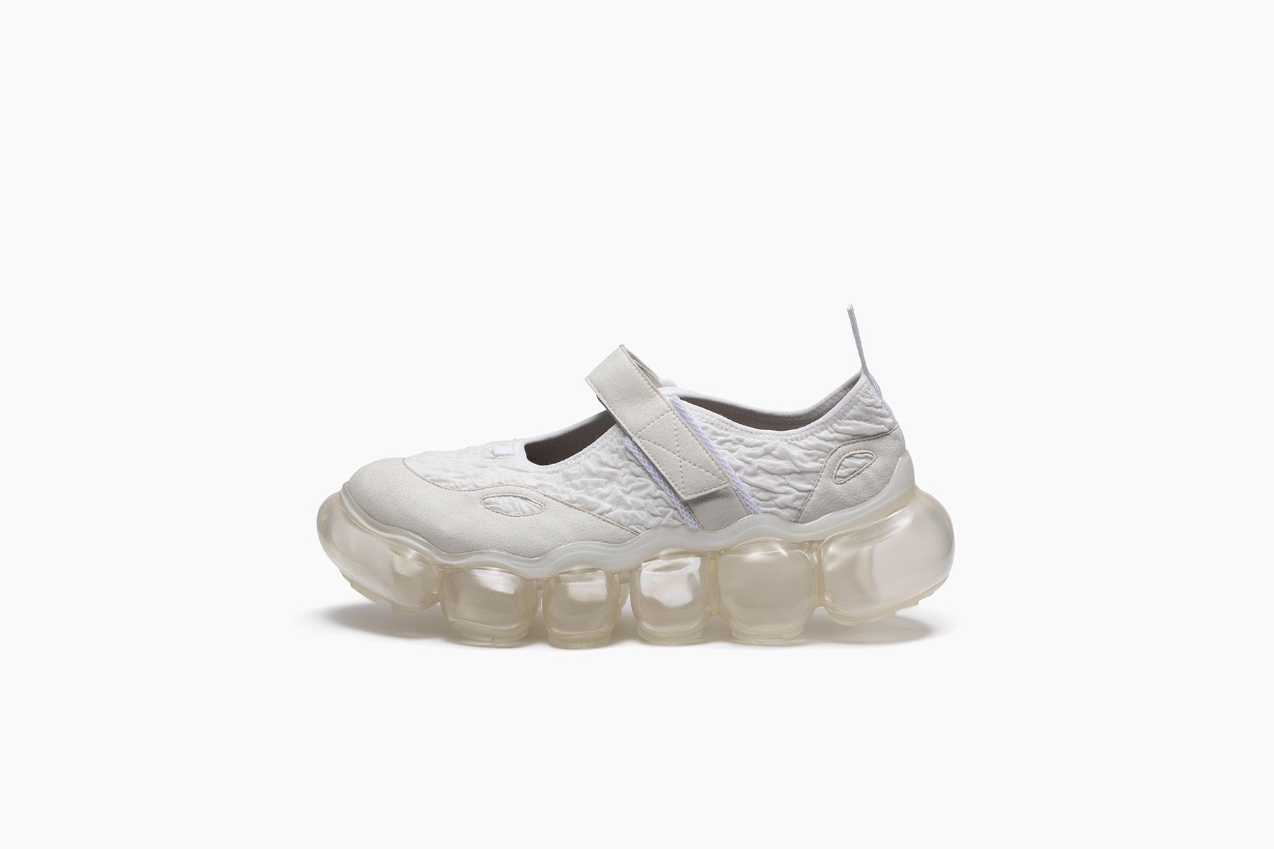セピア調のトーンに包まれた今季のコレクションは、靴を単なる構造やスタイルではなく、「記憶」を宿すものとして再解釈しました。ホワイト、グレー、ヌードやイエローなどを基調としたカラーパレットは、ミニマルでありながらも、60sから70sの時代に感じられる繊細なノスタルジーを表現していて、プラットフォームシューズに宿る文化的な記憶を蘇らせます。