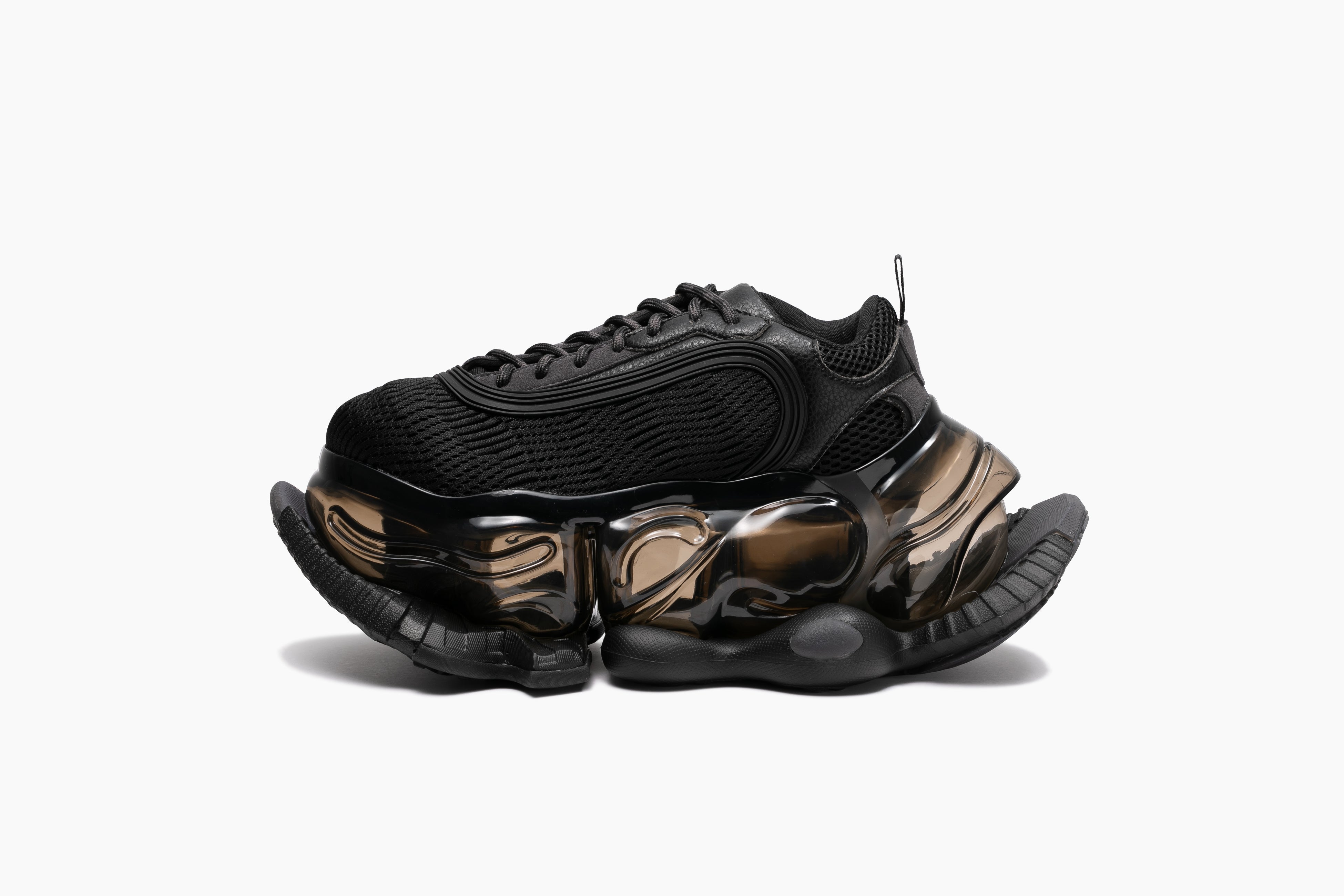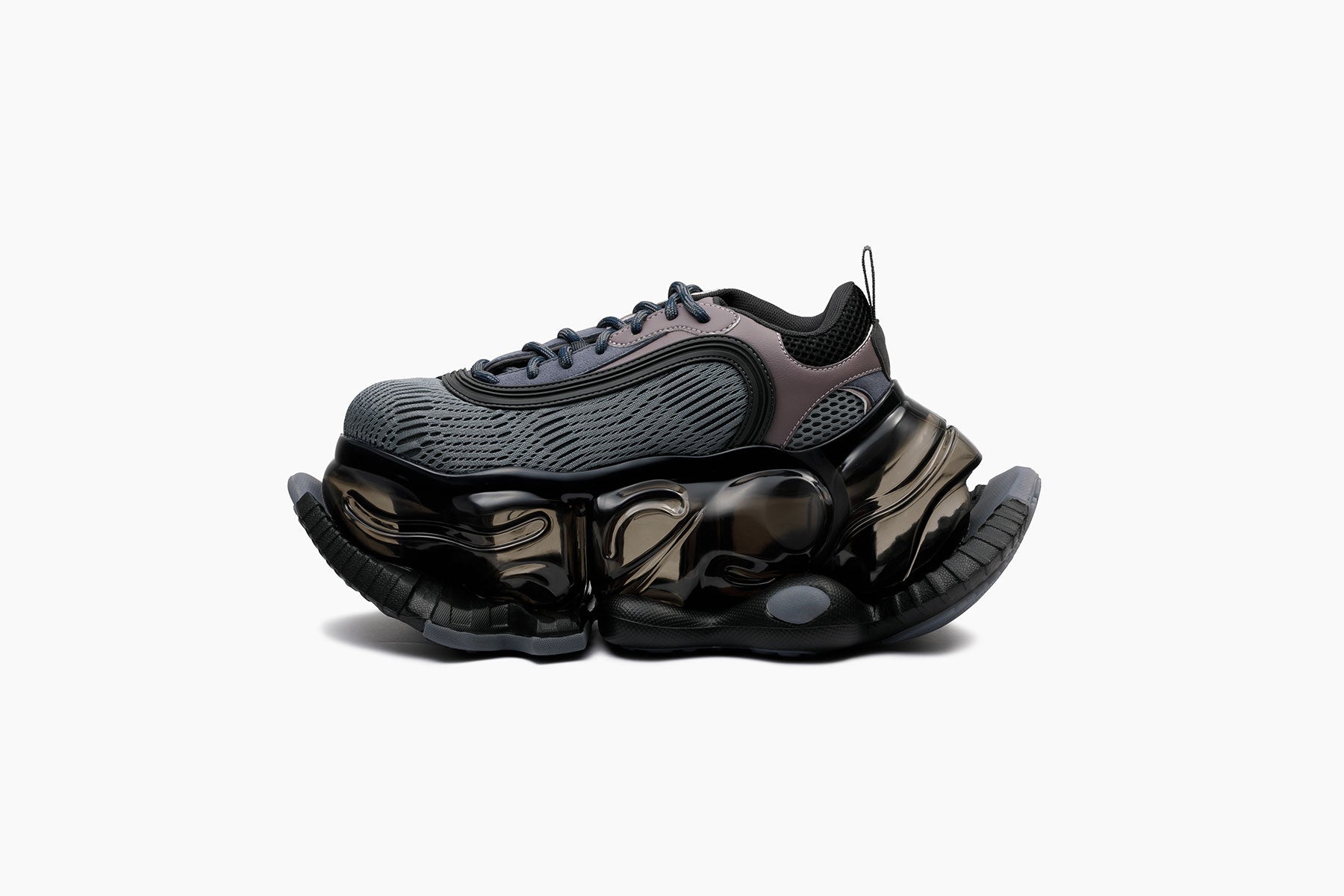SKYSCRAPER LAND SPEEDERは、SF映画に登場するモビリティをイメージしたモデル。ハイスピードで空を割くメカを着想源に、メッシュのパネルとなめらかな曲線のCPUパーツを組み合わせたアッパーと、精密なメカを想起させるボトムパーツ「FALCON」を組み合わせ、近未来感溢れるスタイルに。