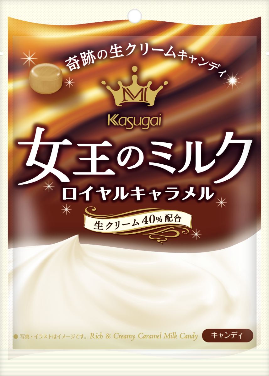 「女王のミルク」ブランドより、新フレーバーの「女王のミルク ロイヤルキャラメル」を発売します。こちらも原材料に北海道産生クリームを40%使用し、そこにキャラメルソースとカラメルソースをブレンドした深いコクのある味が特徴です。焦がさず丁寧に煮詰めることで、キャラメルの豊かな風味が感じられる味わいに仕上げました。生クリームと相性のよいキャラメルフレーバーをなめらかな舌触りで味わうことができ、北海道生クリームのフレッシュな余韻をそのまま楽しめるキャンディです。