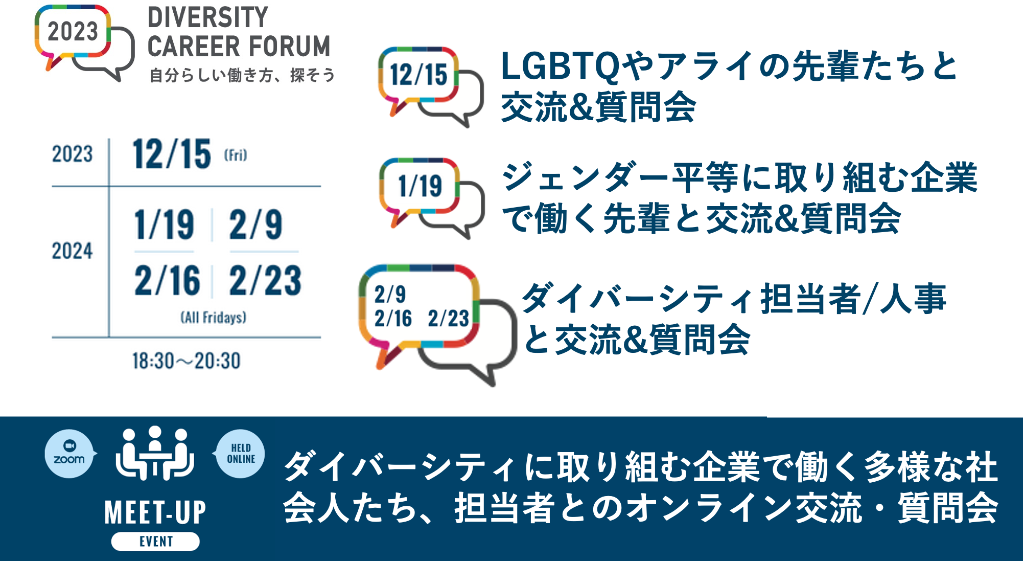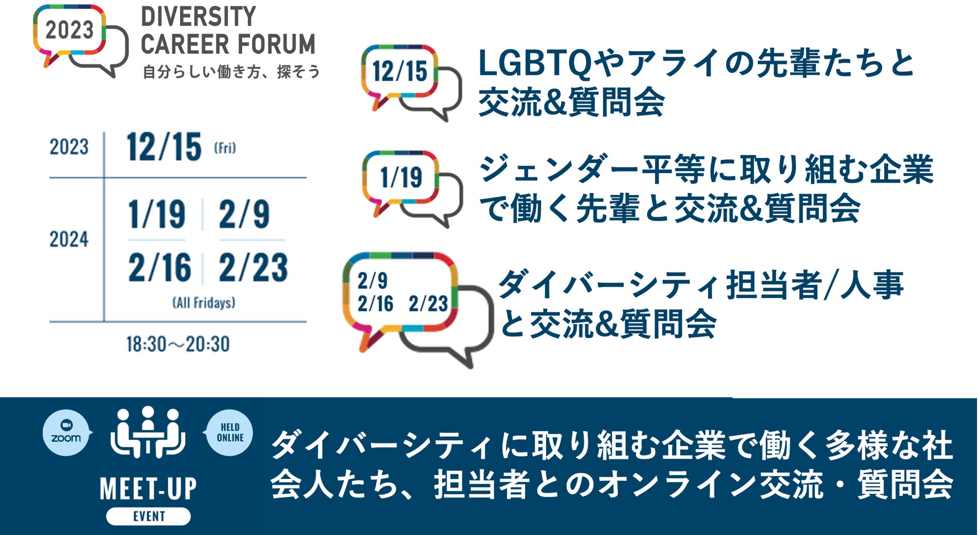 なお、2024年2月23日(金)までは関連イベントであるMEET-UPを実施し、ダイバーシティに取り組む企業で働く多様な社会人やダイバーシティ担当者とのオンラインでの交流機会を提供します。