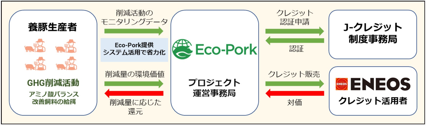 ENEOSホールディングス株式会社(社長:宮田 知秀、以下「ENEOS」)と株式会社 Eco-Pork(代表取締役:神林 隆、以下「Eco-Pork」)は、養豚事業における温室効果ガス(以下「GHG」)削減を目的としたJ-クレジット創出プロジェクト「豚へのアミノ酸バランス改善飼料の給餌プロジェクト」(以下「本プロジェクト」)が、J-クレジット認証委員会において承認され、養豚生産者とのJ-クレジット創出活動を開始したことをお知らせいたします。