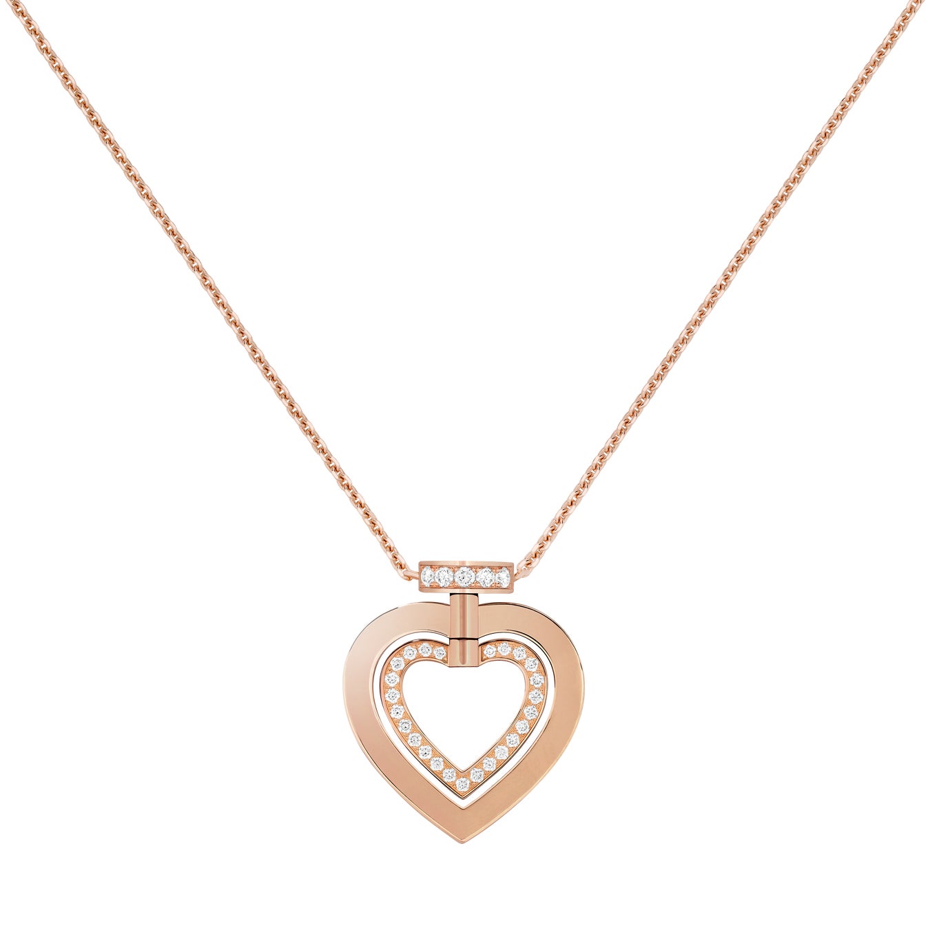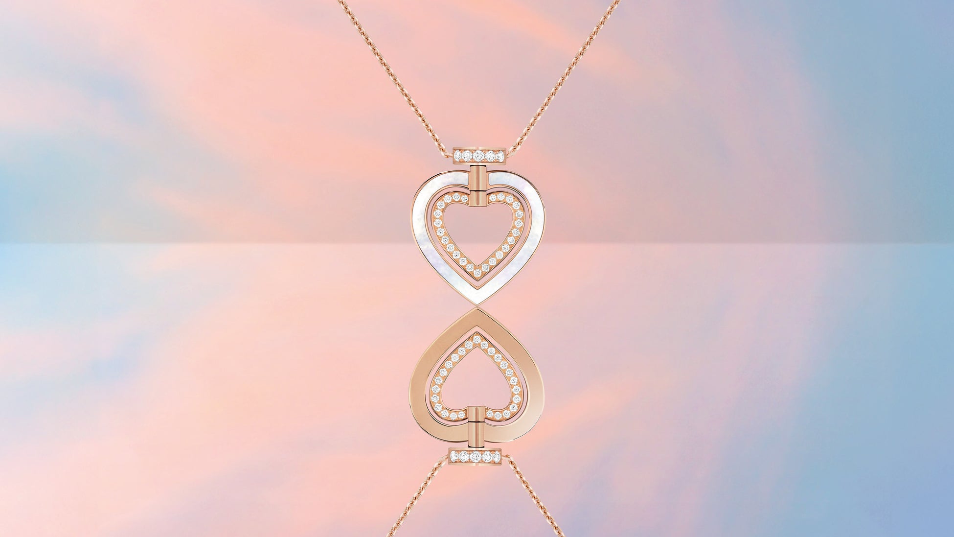 新しいサイズで登場したプリティウーマン イプノティックネックレスは、2つの可動式ハートが、ダイヤモンドとゴー ルドのパヴェクラスプで結ばれています。ひとつはマザーオブパール、もうひとつはダイヤモンドのパヴェ。どちらの ハートもリバーシブルで、裏面にはピンクゴールドがあしらわれ、4 通りの組み合わせが可能。