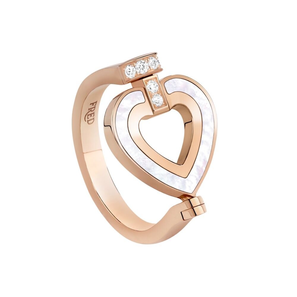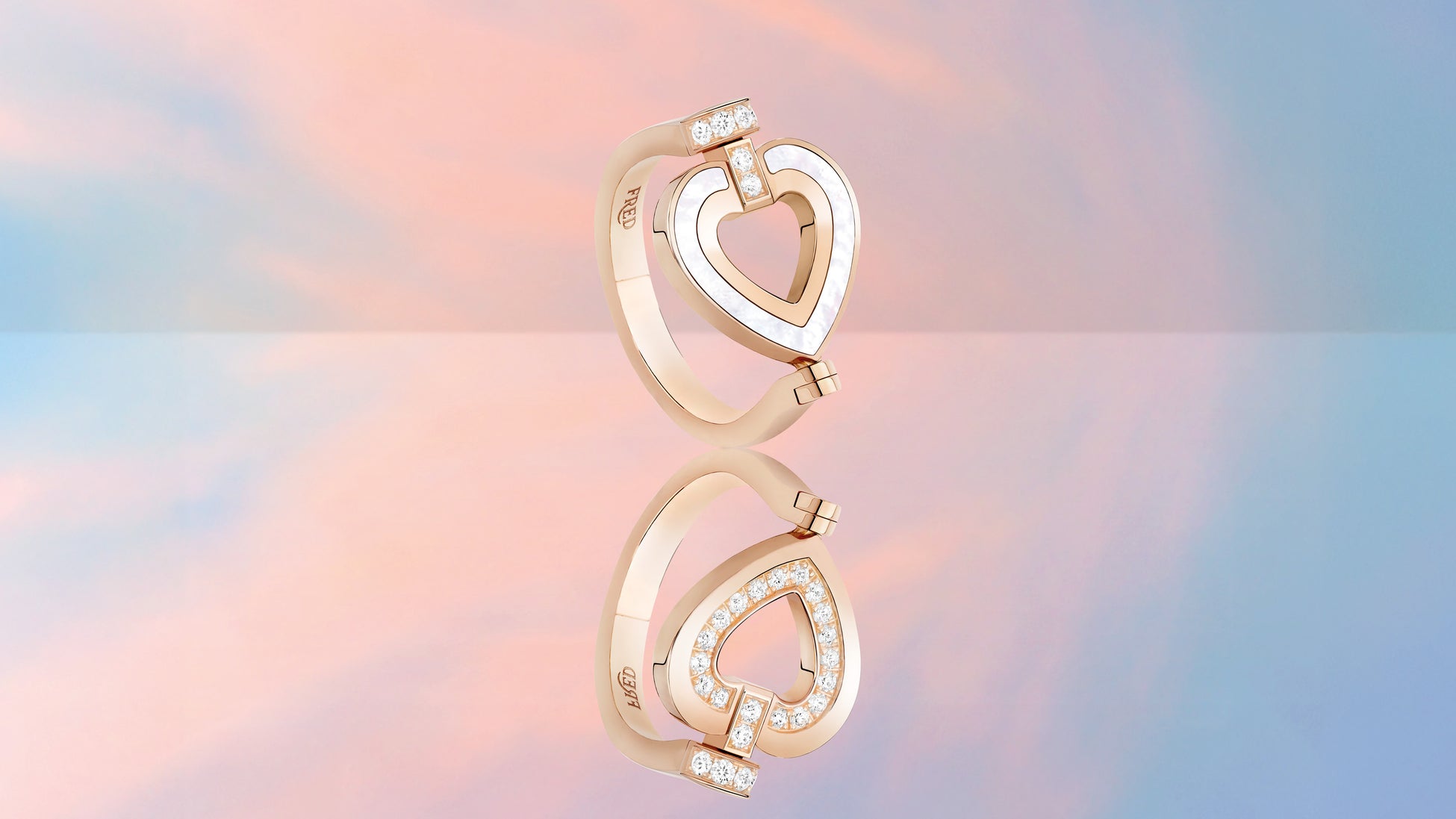 プリティウーマン コレクションのシグネチャーであるハートの中のハートは、すべての視線を魅了し、最も力強い感 情に共鳴する。この 2 つの作品は、その喜びの多様性を示し、イプノティックラインの新たな章を書き記します。この 機会に、フレッドはマザーオブパールにスポットライトを当て、ピンクゴールドとダイヤモンドのデュオをネックレス とリングに組み合わせました。繊細な色合いと女性らしさを醸し出すこの石は、新しいジュエリーに繊細で時代を超 越したエレガンスを与え、メゾンのノウハウとリバーシブルなデザインによってさらに輝きを増します。この洗練され た光のタッチがあらゆるデイリールックを照らします。