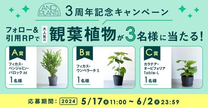 アンドプランツ3周年を記念して、5月17日(金)〜6月2日(日)の期間、Xにてフォロー&引用RPで人気の観葉植物が3名様に当たる、3周年記念プレゼントキャンペーンを開催いたします。