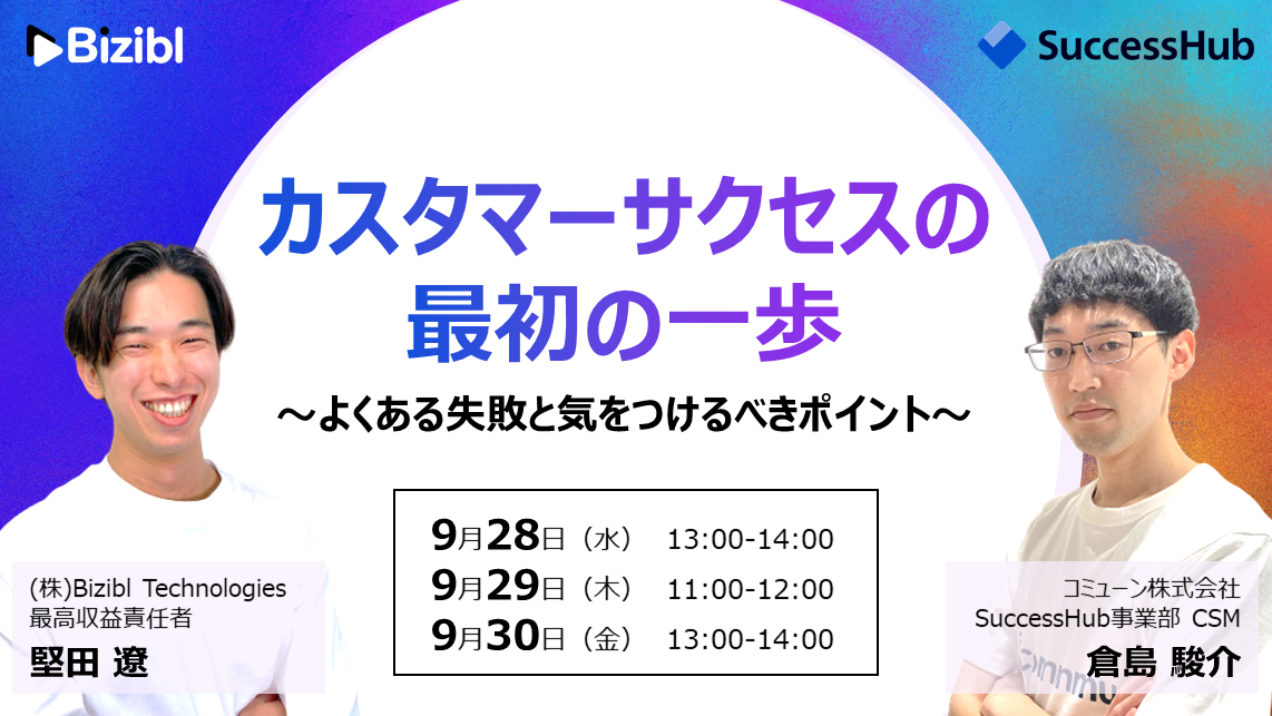 株式会社Bizibl Technologies(本社:大阪市北区、代表取締役:花谷燿平、以下Bizibl)とコミューン株式会社(本社:東京都品川区、代表取締役CEO:高田優哉、以下コミューン)が 「カスタマーサクセスの最初の一歩〜よくある失敗と気をつけるべきポイント〜」 と題したウェビナーを9月28,29,30日に連日開催いたします。