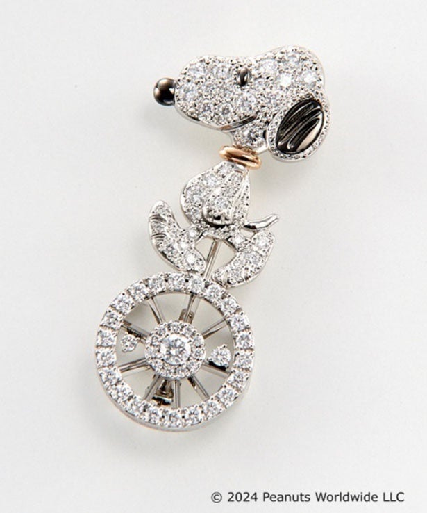 今回発売する新作ダイヤモンドジュエリーは、PEANUTS™︎ の大人気キャラクター、SNOOPY(スヌーピー)をモチーフに、御所車を象(かたど)ったモダンなジュエリー、『「kagayoi」かぐるまコレクション』として、ブローチ、ピンブローチ、ペンダントの3種類を展開いたします。ダイヤモンドの輝きと車輪のスポークの輝きのコントラストで、華やかさだけではなく装いに上品さを与えるハイジュエリーに仕上げました。
