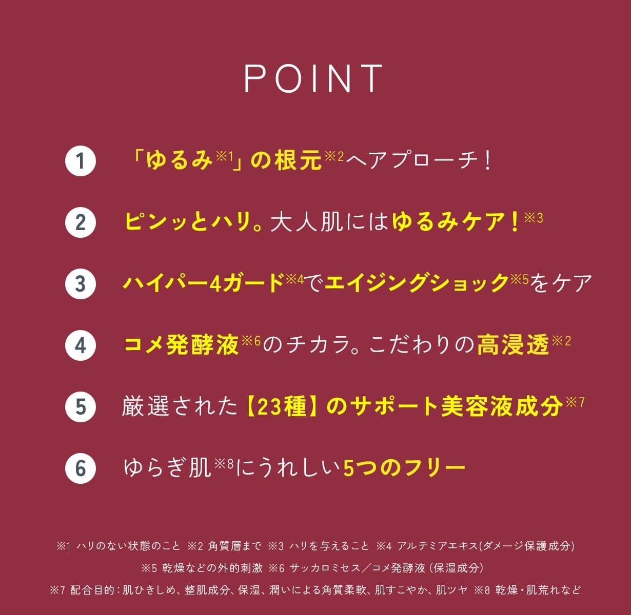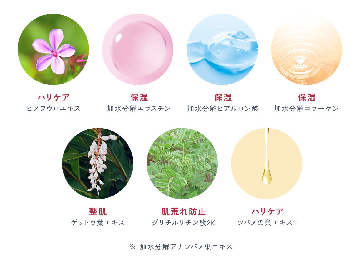 ※1 ハリを与えること ※2 トリフルオロ酢酸テトラデシルアミノブチロイルバリルアミノ酪酸ウレア、カエサルピニアスピノサ果実エキス、カッパフィカスアルバレジエキス(ハリケア成分)※3 角質層まで