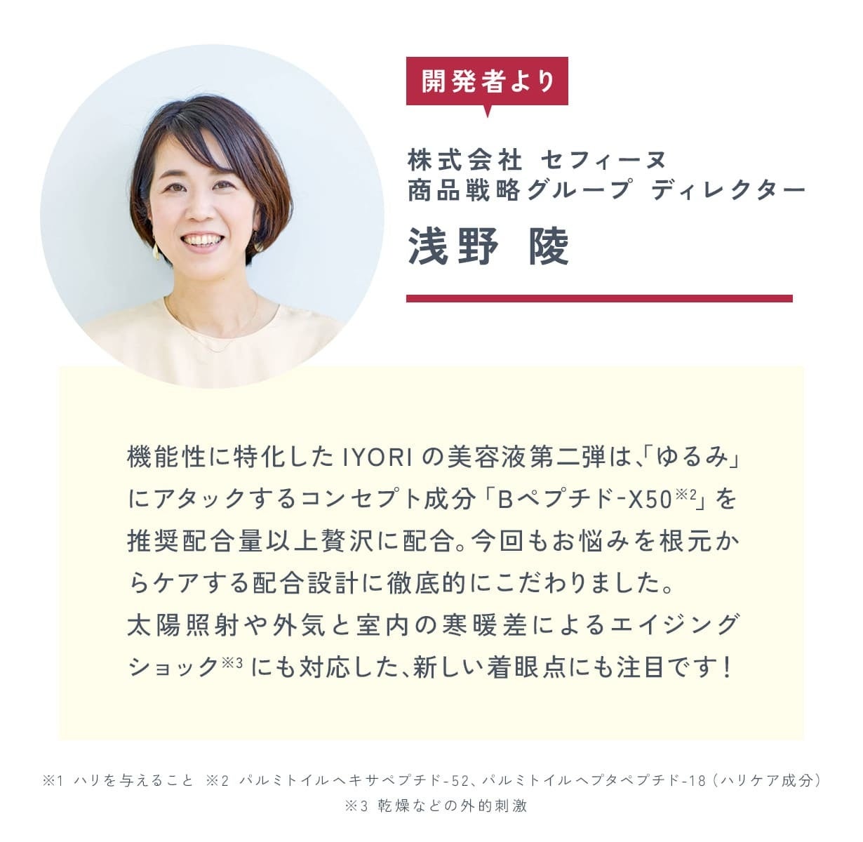 24時間365日、紫外線・乾燥・加齢など様々なダメージに晒される現代女性の肌悩みは、十人十色。「IYORI」は、プロ用コスメメーカーとして実績を積んだセフィーヌの皮膚理論・エビデンスに基づいた高機能スキンケアをコンセプトに、一人ひとりのお肌に向き合い、悩みから解放される喜びを実感していただける「I(自分)にYORI(より)そう」ブランドです。