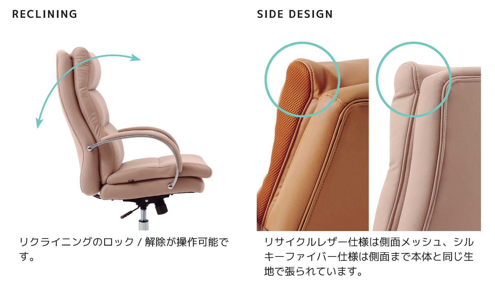 発売当時の2015年とは異なり、現在は環境に配慮した製品づくりも求められるようになっています。グラントチェアは販売当時から、環境に優しい「リサイクルレザー」を使用したタイプを販売しています。そして今回、新たに「シルキーファイバー」を使用した3色を追加します。
