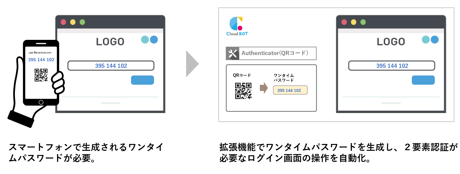 この拡張機能を使う事で、ワンタイムパスワードの生成、入力、認証の全てをクラウド上で実現できるため、2要素認証で保護されたWebサイトに対しても自動操作を行う事が可能になりました。