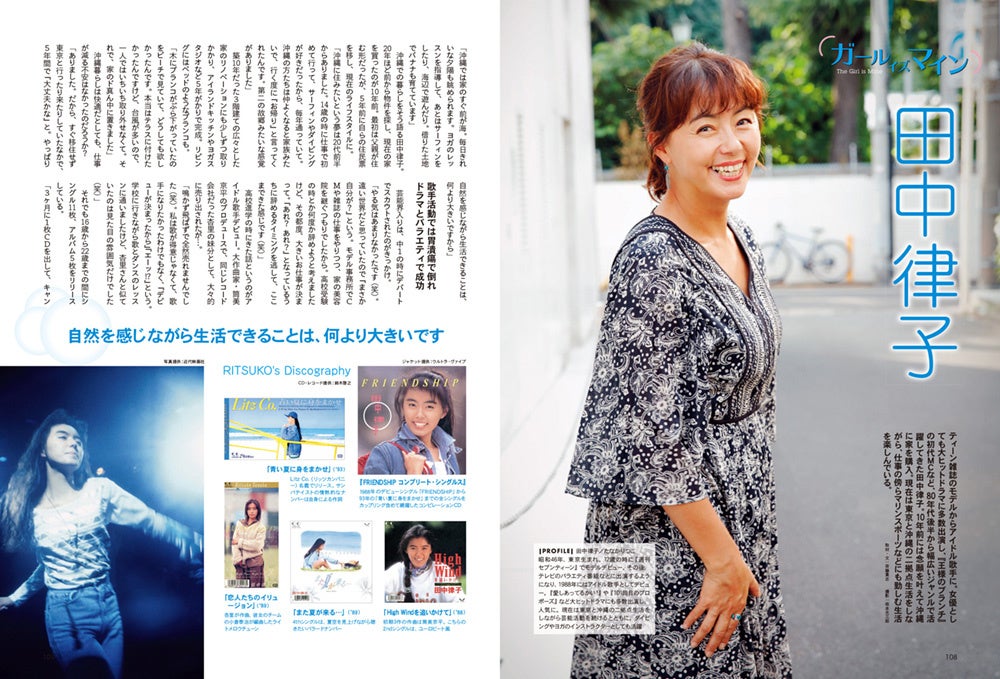 ティーン誌のモデルからアイドル歌手に。女優としても大ヒット作に多数出演し、『王様のブランチ』の初代MCなど80年代後半から幅広いジャンルで活躍する田中律子。10年前に念願を叶え沖縄に家を購入。東京との二拠点生活をしながら、仕事の傍らマリンスポーツなどにも勤しむ生活を楽しんでいる。