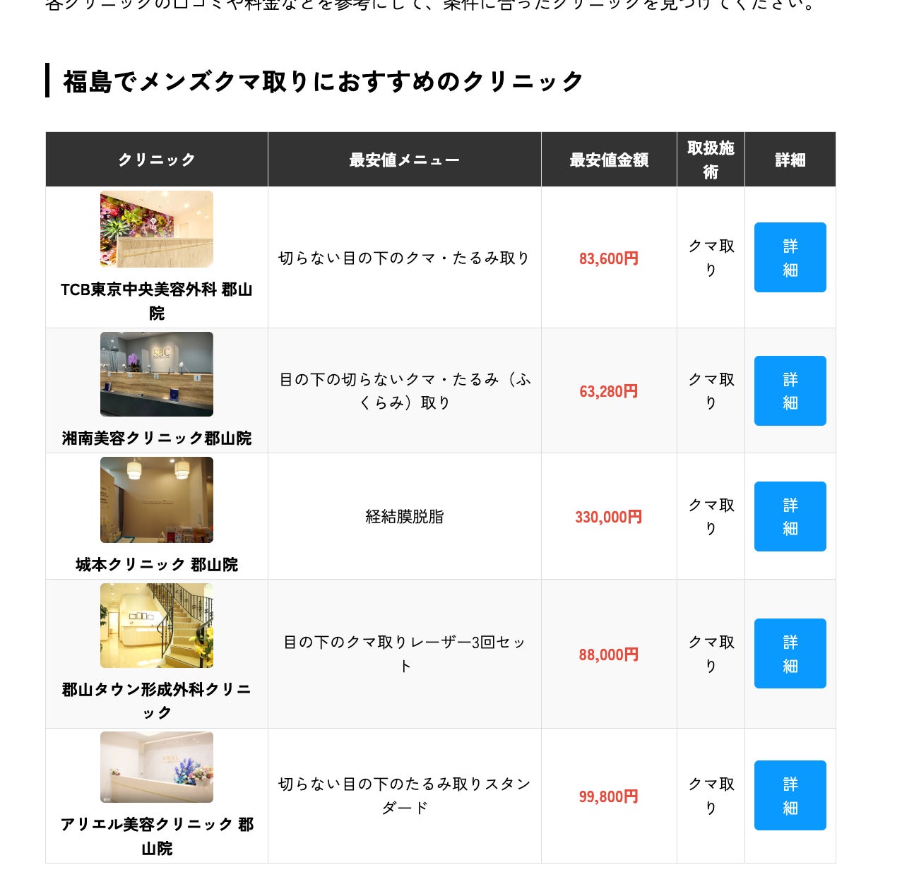 導入例の記事では、「クリニック/最安値メニュー/最安値金額/取扱施術/詳細」の形式で一覧化しています。