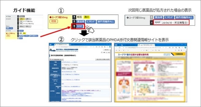 ① ガイド機能にてRMPが存在する医薬品に「RMP」ボタンを表示します。
