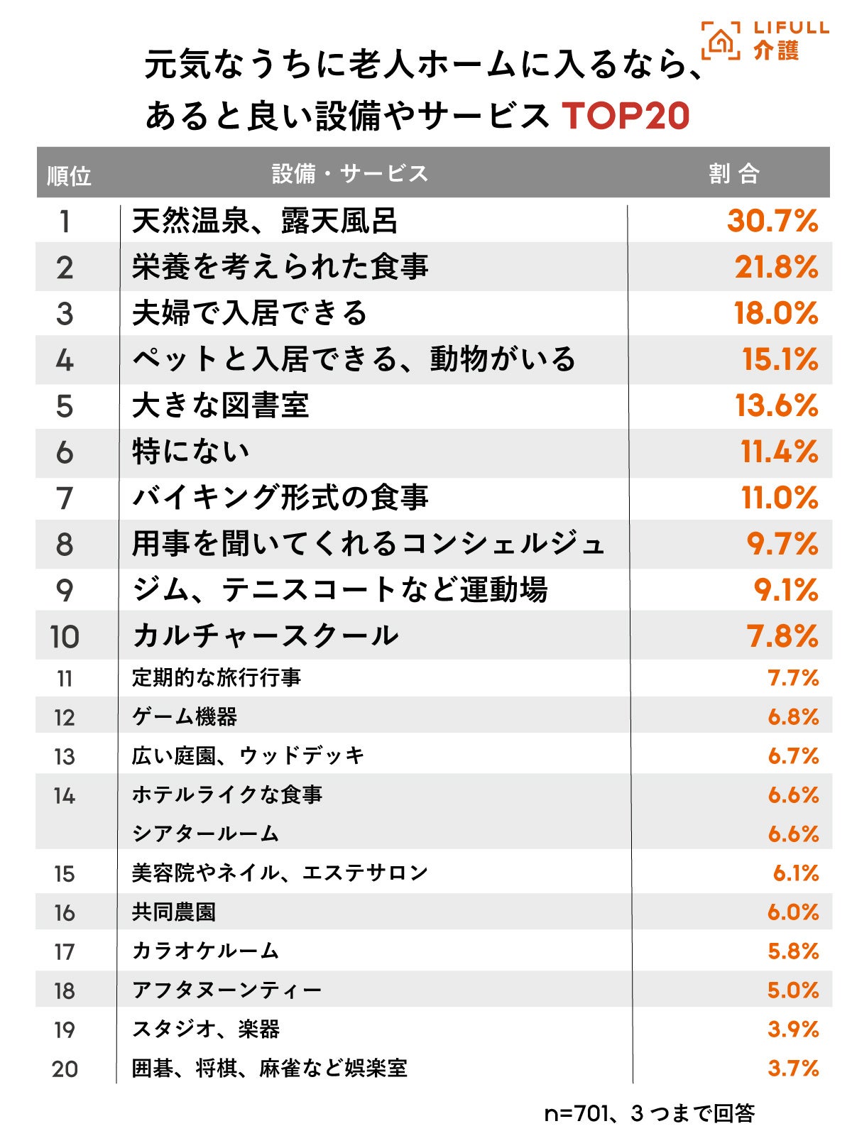元気なうちに入る老人ホームにあって欲しい設備やサービスについて尋ねたところ、「天然温泉、露天風呂」が30.7%と最多回答となりました。次いで「栄養を考えられた食事」(21.8%)、「夫婦で入居できる」(18.0%)となりました。「大きな図書室」(13.6%)や「ペットと入居できる」(15.1%)も人気を集めています。